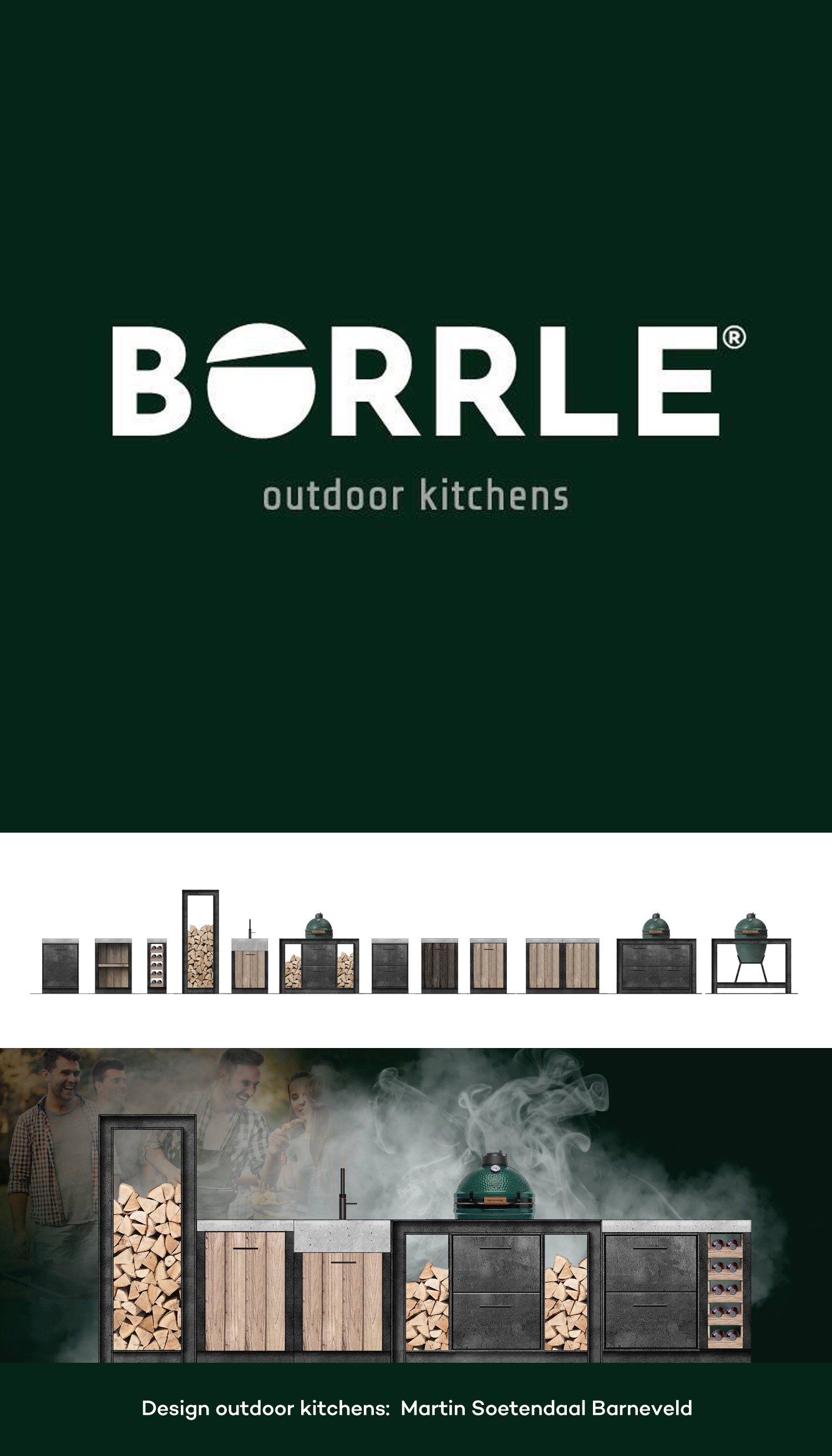 Buitenpracht Stijlvolle Houtbouw uit Barneveld belde met de vraag of wij een luxe buitenkeuken konden ontwerpen in beton, staal en hout. Nadat wij ons ‘ja-woord’ hadden uitgesproken, volgden er een paar brainstorm-sessies. Martin Soetendaal is daarna begonnen aan het ontwerp-proces. Dit proces is in grove lijnen te zien op deze pagina. Van een schets van negen lijntjes tot en met de oplevering van de eerste Borrle bij de klant!